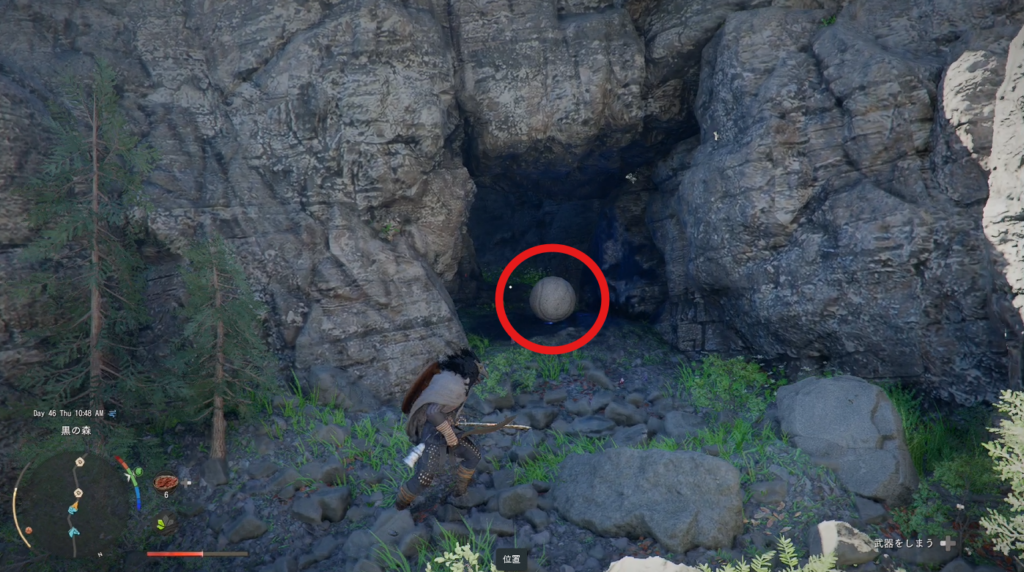 このスクショにある石でできた丸い門を抜けてすぐのところです。