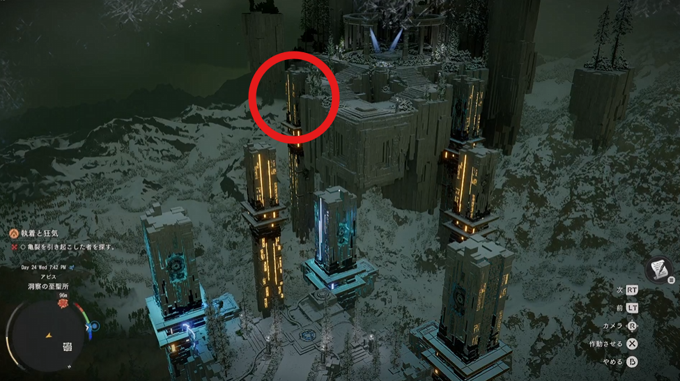 2 光っている塔の足場を移動させるギミックになっているため、RTまたはLTで足場を移動させたい塔を選ぶ 3 自分が立っている位置の足場が移動する塔を光らせた状態で、Xで作動させると次の塔に進むことができる 4 2~3を繰り返し、マーク位置の塔まで移動する