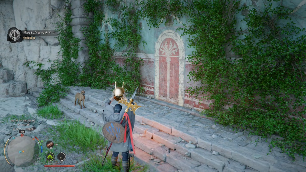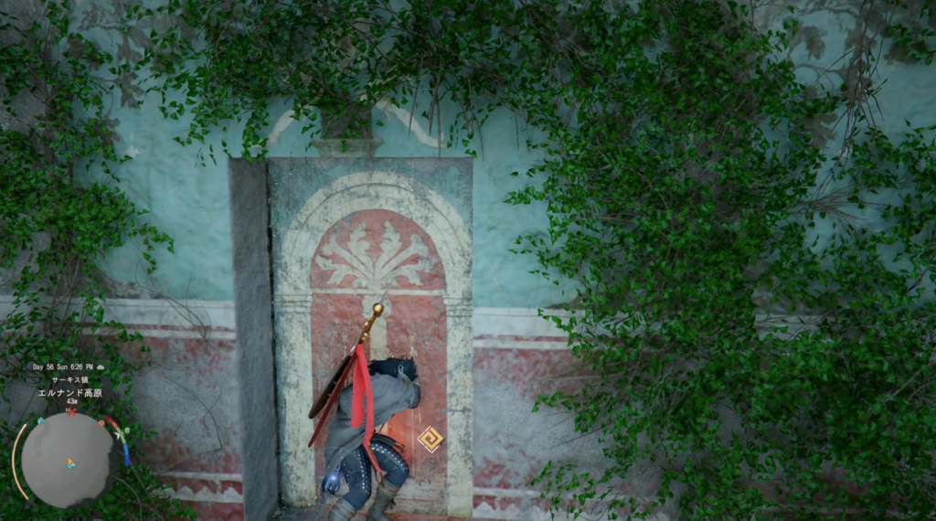 1 崖上の大穴を見つけ、滑空スキルで穴の中腹に降りる 2 崖中腹にある扉をランタンで照らし記憶を見る 3 扉を押し込み中に入る