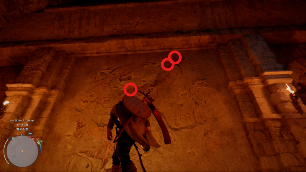 1 石室内の壁に描かれた壁画を確認する 2 壁画のバツマークが示す場所に行き、ヒントを確認する(答えがわかっている場合現地に行かなくてもOK)