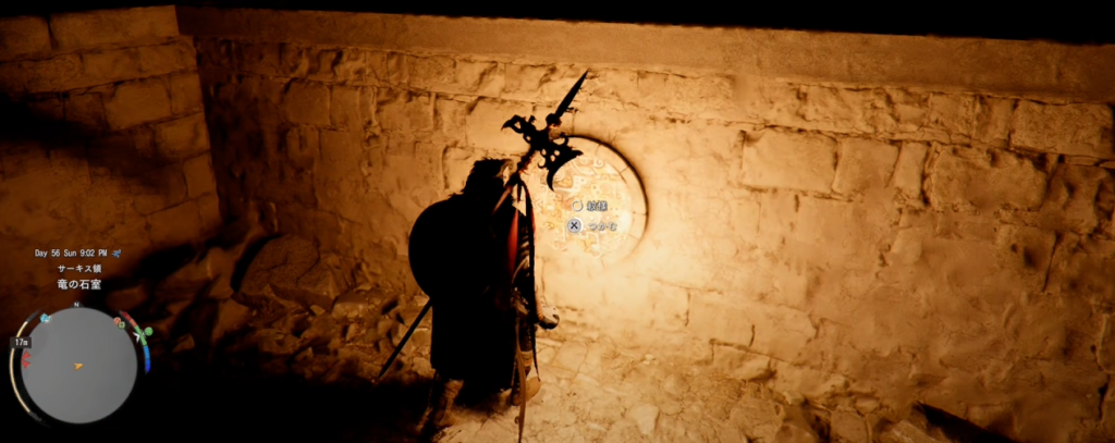 1 石室中央の窪みにある3つの回転する円盤にXで触る 2 壁画のヒントから確認した向きに円盤を合わせる 3 3つ全て正しい向きに揃えると奥の扉が開く