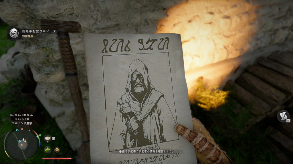 1 エルナンド農家でヤンと会話する 2 近くにある指名手配書を手に取り、知識を入手する 3 馬に乗りヤンとともに目標位置へ移動する 4 目標位置に到着するとヤンが離脱する