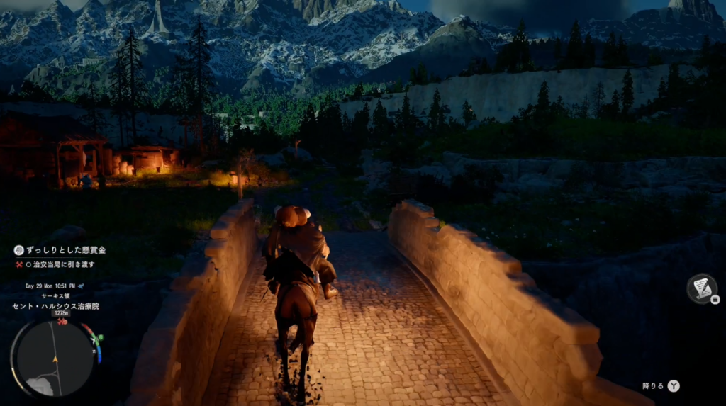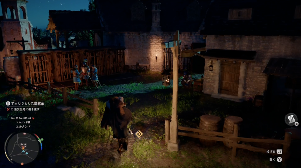 1 馬に乗り、マーカーが更新されたエルナンドの治安当局へ向かう 2 治安当局に指名手配犯を引き渡す 3 狼の丘拠点に戻りヤンに会話してクエストクリア