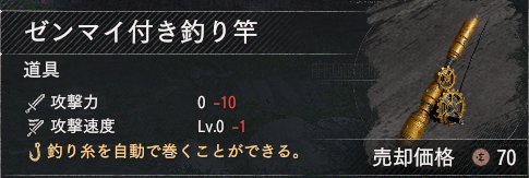 | 報酬 | 好感度MAX報酬でゼンマイ付き釣り竿 |