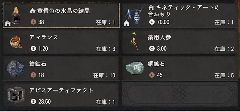 「パトリジオ(秘密商人)」の取り扱いアイテム