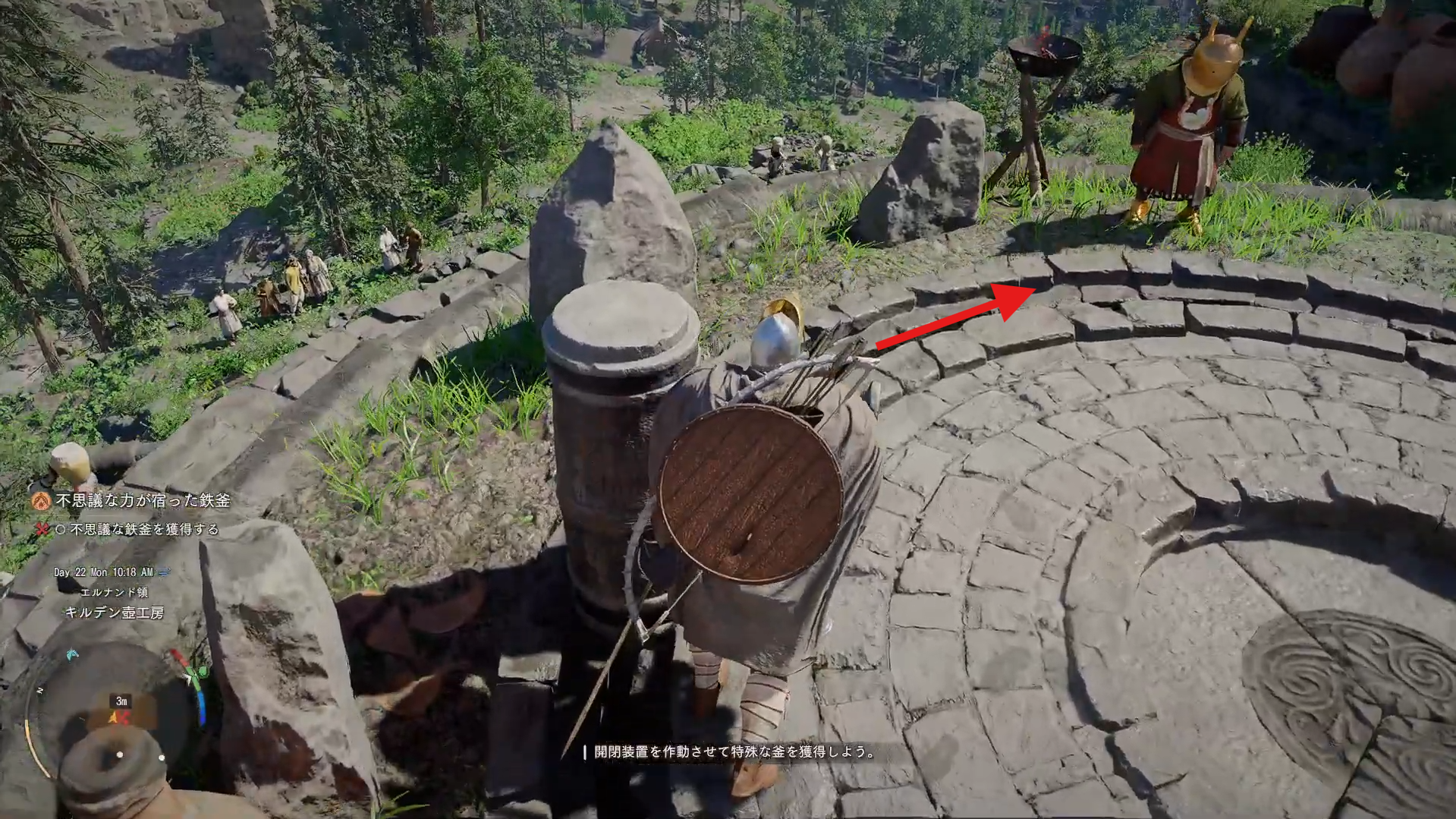 1 時間になったら、もう一度グリムニルに話しかける 2 取っ手の付いた石柱を時計回りに回す 3 床が開いて鉄釜が出てくるので拾う