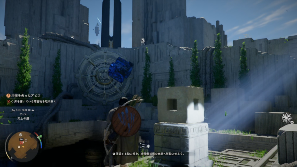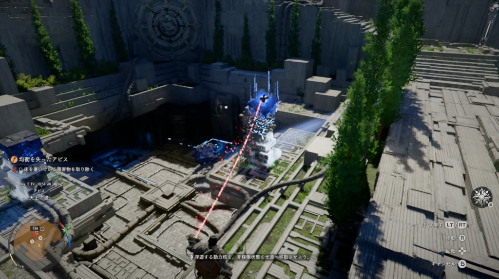- 摂理の力(左スティック押し込み)で青いキューブを石像に乗せる手順