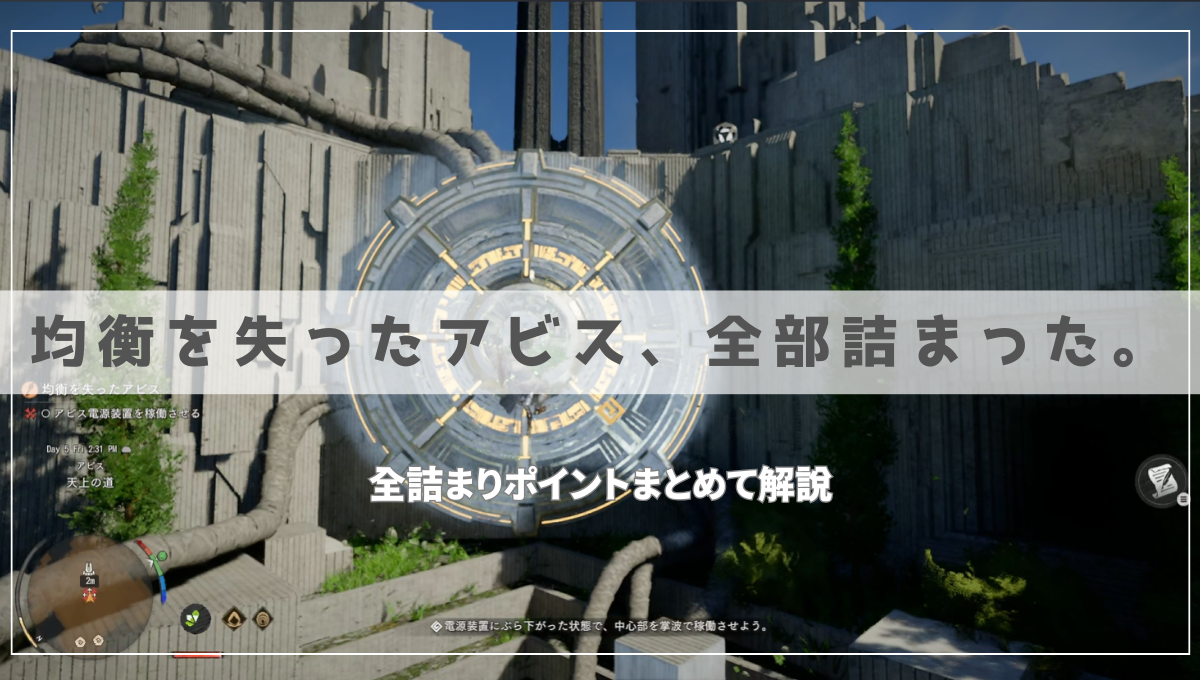 チャレンジクエスト「均衡を失ったアビス」の天上の道は、詰まりポイントが4つ連続で続く難所です。特にフラグの立て忘れと摂理の力・掌波の操作が複合するため、一つでもわからないと完全に進行不可になります。この記事では実際にプレイして詰まった箇所を順番に解説します。