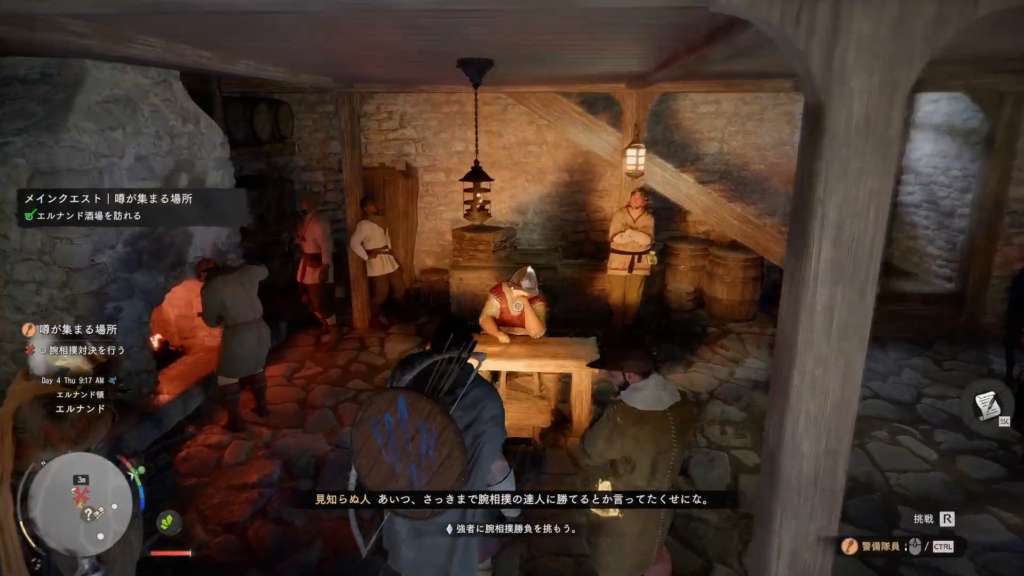 1 マーク位置のエルナンド酒場へ向かう 2 座っている警備隊員に挑戦する 3 腕相撲のミニゲームで戦い勝利する