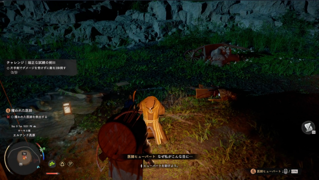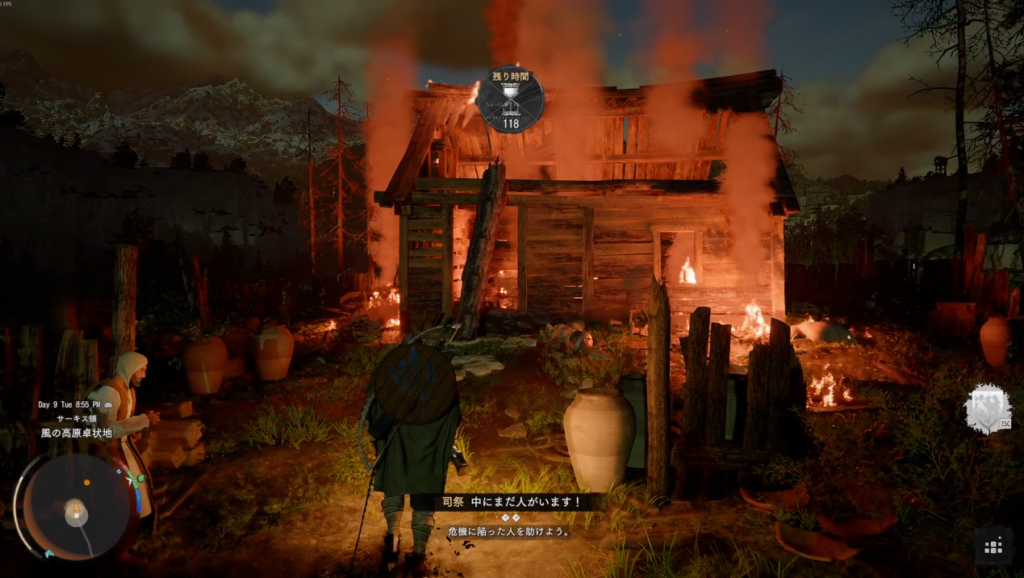 マーク位置に向かい、助けを求める修道女と会話。さらに移動して燃えている家へ向かう。