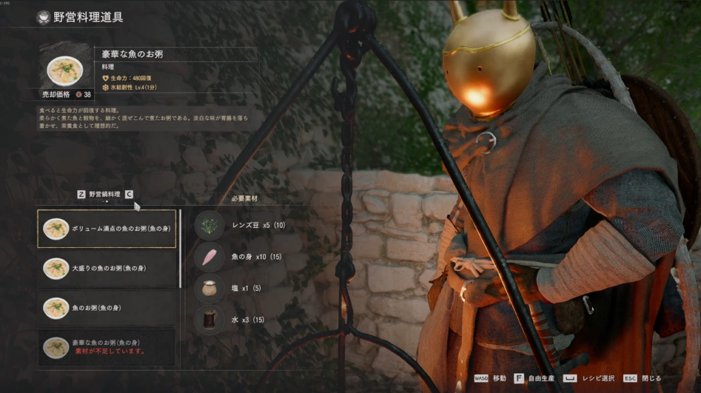 - 料理メニューから「野営鍋料理」の「魚のお粥」を選択し、3個作成する。