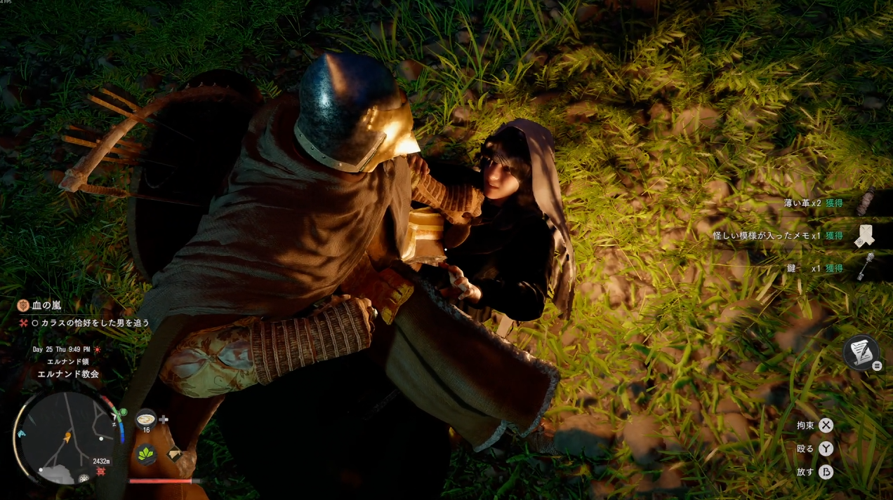 - Yボタンを押し複数回殴ると怪しいメモを獲得し、Xで拘束できるようになる。