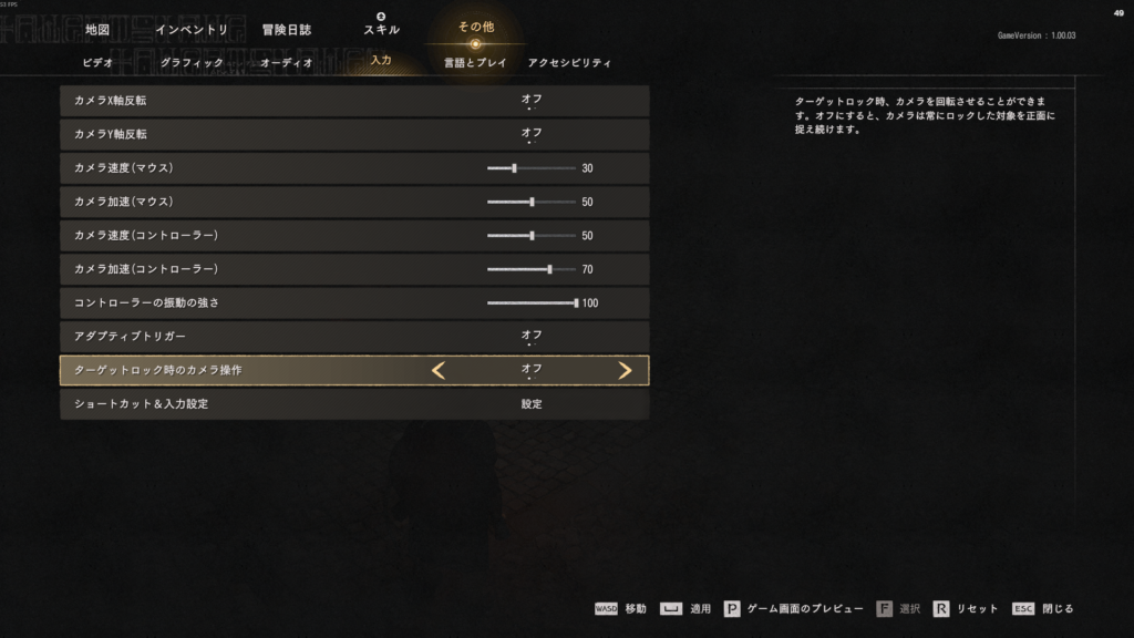 メニュー>その他>入力>ターゲットロック時のカメラ操作